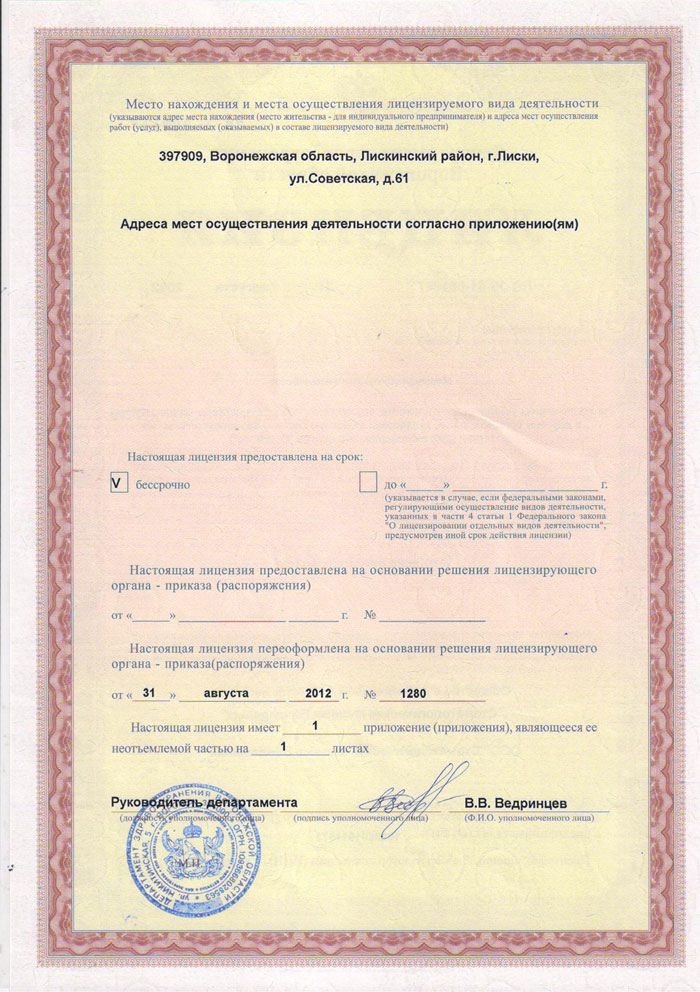 Лицензия на осуществление медицинской деятельности № ЛО-36-01-001057 от 31.08.2012 года, выдана Департаментом здравоохранения Воронежской области (394036 г. Воронеж, ул. Никитинская, д. 5 тел. (473)255-42-53):